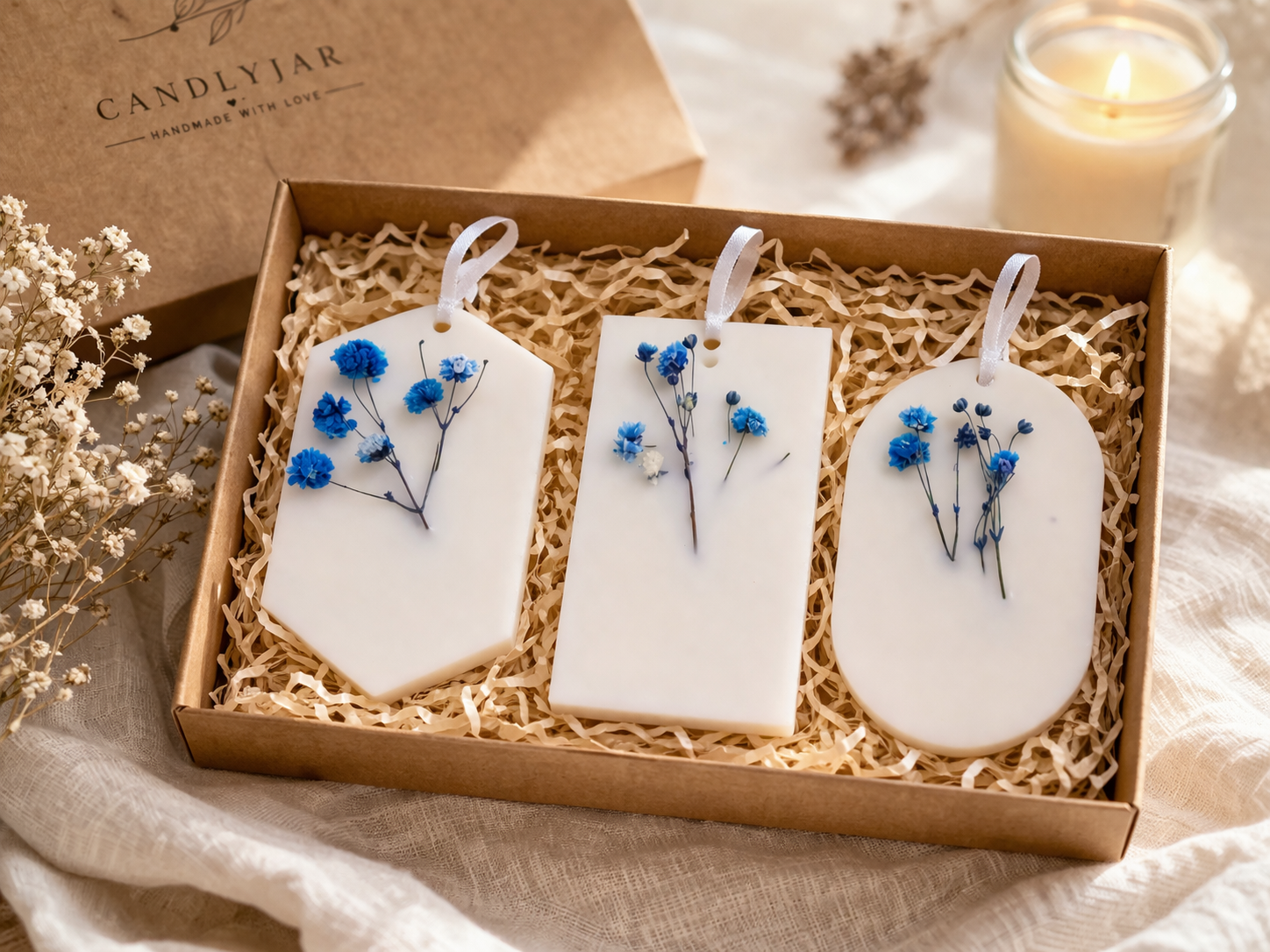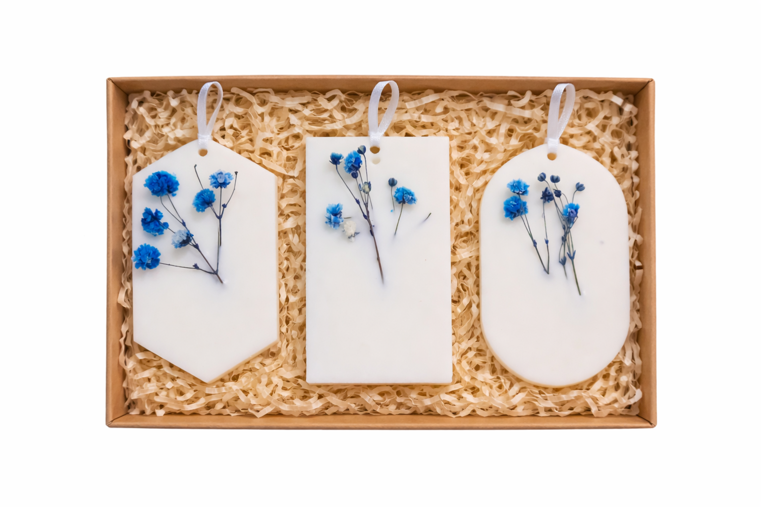 Το σετ περιλαμβάνει τρεις αρωματικές ταμπλέτες σόγιας, διακοσμημένες με μπλε αποξηραμένα άνθη, δημιουργώντας ένα minimal και ταυτόχρονα ξεχωριστό αποτέλεσμα. Κάθε κομμάτι είναι χειροποίητο και μοναδικό, σχεδιασμένο για να αρωματίζει απαλά ντουλάπες, συρτάρια και μικρούς χώρους.
